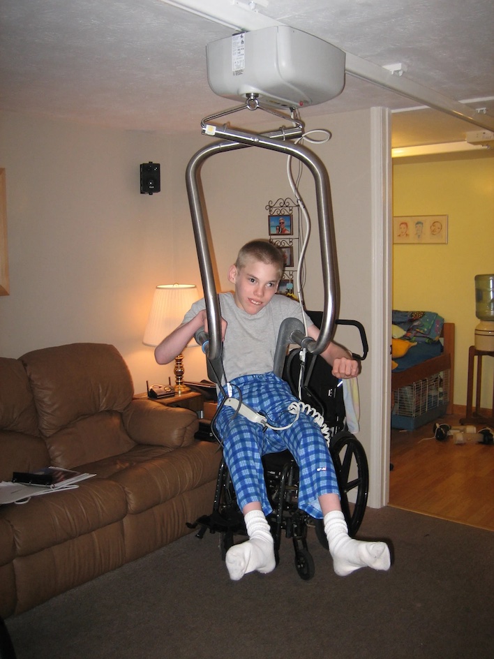 - Gia đình đã áp dụng nhiều chỉnh sửa môi trường, công nghệ trợ giúp cho trẻ (Mục Sản phẩm và Công nghệ trong Môi trường của ICF!): Thay đổi nhà bằng mở rộng cửa và lối đi cho xe lăn, chỉnh sửa phòng tắm và phòng ngủ (rất tiếc case study này không minh hoạ những điều chỉnh này), hệ thống nâng (hoist) bằng ròng rọc để đưa trẻ từ giường -xe lăn hoặc đến các vị trí khác trong nhà qua đường ray gắn trần nhà. Trên thực tế, dịch chuyển trẻ là một công việc nặng nề, tốn công sức, và sử dụng các dụng cụ trợ giúp như hoist như thế này là một công cụ hữu hiệu cho gia đình. Hệ thống này có thể hoạt động bằng động cơ (có lẽ như trong trường hợp này), nhưng cũng có thể tự chế bằng ròng rọc một cách đơn giản (như sử dụng tời kéo quay tay). Trẻ cũng được sử dụng ghế ngồi lắp ráp, ghế ngồi dạng đúc riêng, xe lăn điện … để có thể tự di chuyển, tham gia sinh hoạt gia đình và xã hội. Một nhận xét nhỏ ở trường hợp này là ghế ngồi đúc riêng sẽ được thực hiện ở một cơ sở chuyên biệt (dịch vụ xe lăn). Qua phần bổ sung ở trên, có thể thấy là ghế ngồi đúc riêng này có nhược điểm là cố định, không phù hợp khi trẻ phát triển, và đó là lý do trở nên không còn phù hợp ở trẻ này.