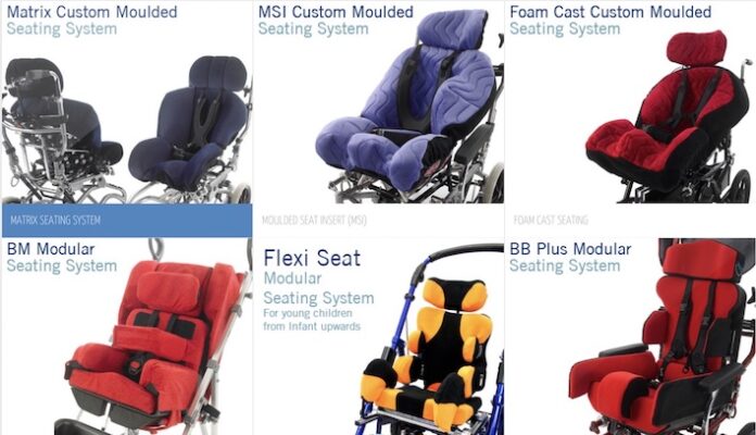 - Chỗ ngồi dạng lắp ghép (mô-đun) sử dụng các thành phần có thể điều chỉnh được chẳng hạn như mặt tựa ngồi, tựa lưng, gác chân, miếng đỡ đầu và chân đế di chuyển cùng với lựa chọn các phụ kiện như nâng đỡ khung chậu và nâng đỡ hai bên thân mình có thể được kết hợp để làm thành một hệ thống ngồi phù hợp với trẻ.