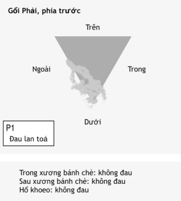 - Đau lan tỏa “không thể chỉ chính xác được”, ở bên ngoài và bên dưới xương bánh chè (xem hình vẽ)