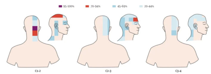 - Đau sâu (không đau theo nhịp đập) từ sau chẩm đến vùng trán bên phải. Bệnh nhân cũng phàn nàn về cảm giác cột sống cổ ở bên phải có cảm giác cứng. Đau cổ và đau đầu dường như có liên quan với nhau (xem Hình)