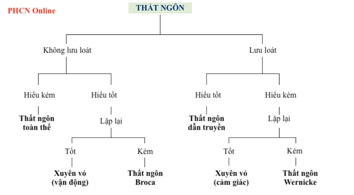 Có nhiều cách phân loại hội chứng mất ngôn ngữ. Phân loại hữu ích nhất về mặt lâm sàng chia chứng mất ngôn ngữ thành hai loại chính: lưu loát và không lưu loát (Hình 1). Theo nguyên tắc đơn giản, bệnh nhân mất ngôn ngữ lưu loát sẽ bị tổn thương ở vùng Wernicke hoặc các vùng xung quanh, trong khi bệnh nhân mất ngôn ngữ không lưu loát sẽ có tổn thương ở vùng Broca hoặc các vùng xung quanh. Hầu hết bệnh nhân sẽ có bệnh cảnh lâm sàng hỗn hợp với các thành phần của cả hai hội chứng. Các nhà lâm sàng nên xác định các đặc điểm nổi trội của rối loạn giao tiếp và sau đó thiết lập chẩn đoán, tiên lượng và kế hoạch xử trí thích hợp. Ví dụ, hầu hết tất cả các bệnh nhân bị chứng mất ngôn ngữ sẽ bị khiếm khuyết định danh (nominal impairment), “không thể gọi tên các đồ vật”. Nhưng chỉ nên sử dụng thuật ngữ mất ngôn ngữ định danh khi bệnh nhân gặp khó khăn trong việc gọi tên đồ vật là đặc điểm nổi bật nhất của khiếm khuyết khả năng giao tiếp của họ. Thuật ngữ mất ngôn ngữ toàn thể có thể được sử dụng để mô tả một bệnh nhân có các yếu tố mất ngôn ngữ gần như ngang nhau.