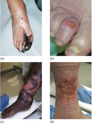 - Một chi đau cấp tính, xanh tái, vô mạch cần được đánh giá khẩn cấp vì điều này chứng tỏ tổn thương động mạch cấp tính. Tương tự như vậy, hoại tử hoặc loét lan đến xương nên được tư vấn phẫu thuật ngay lập tức. Việc cắt bỏ vết thương hoại tử thường là cần thiết để loại bỏ các mô bị hoại tử và thúc đẩy quá trình lành vết loét.