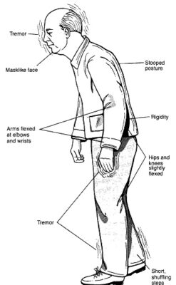 - Ở bệnh Parkinson, do lượng dopamine giảm gây mất cân bằng sự hưng phấn và ức chế trong hệ thống nhân xám, làm giảm hoạt hoá vỏ não, gây rối loạn vận động.