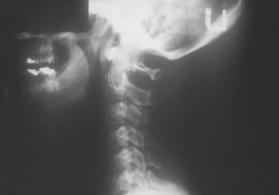 - Nên chụp X quang để loại trừ gãy xương ở những bệnh nhân bị chấn thương và những bệnh nhân có thay đổi ý thức (như say rượu), hoặc đau cột sống cổ và có các dấu hiệu thần kinh khu trú với giảm tầm vận động khi khám lâm sàng. Mặc dù phim chụp nghiêng có thể thấy mất đường cong ưỡn sinh lý, kết quả này có thể là do sự co thắt của các cơ cạnh cột sống cổ và không có ý nghĩa nào khác (Hình 4).