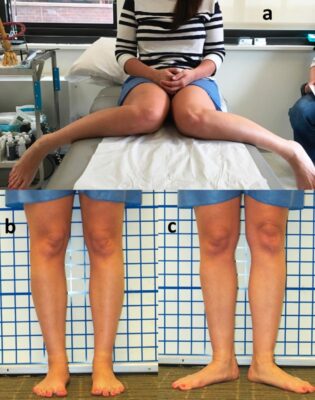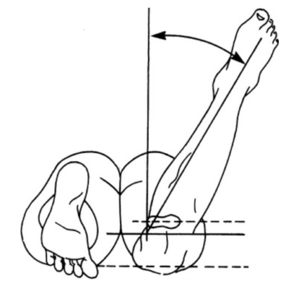 - Biến dạng gập góc ở chi dưới (chân chữ O và chân chữ X) với đo khoảng cách giữa hai gối (giữa hai lồi cầu trong, intercondylar) và giữa hai mắt cá trong (intermalleolar) và góc Q.