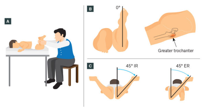 Xoay ở háng (đùi) thường được đánh giá với bệnh nhi ở tư thế nằm sấp, háng duỗi và gối gập đến 90°. Đánh giá tầm xoay trong và xoay ngoài của khớp háng. Gia tăng xoay trong khớp háng biểu hiện vặn trước của xương đùi, ngược lại tăng xoay ngoài có thể là biểu hiện của vặn sau và đụng chạm xương đùi – ổ cối. Để xác định mức vặn ra trước của xương đùi có thể đánh giá test Craig: đo góc giữa xương chày và trục đứng dọc vuông góc với mặt giường. Góc này ở người bình thường khoảng 15 độ.