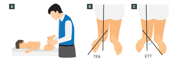 Cần quan sát tư thế, đánh giá dáng đi và xác định các vị trí gây bất thường xoay (xương đùi, xương chày hay là bàn chân). Những trường hợp đặc biệt cần lưu ý là biến dạng xoay không đối xứng, biến dạng cứng và tăng tiến, mức độ xoay nhiều quá các giới hạn bình thường, thường xuyên ngã ảnh hưởng đến sự tham gia ở các trẻ tuổi học đường.