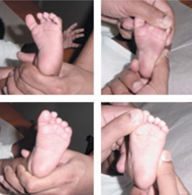 Biến dạng bàn chân khép (lệch vào trong của các xương bàn đốt ở khớp cổ bàn chân), là một chẩn đoán lâm sàng ở trẻ tuổi bú mẹ. Bờ ngoài bàn chân cong lồi thay vì thẳng (hình chữ C), và có thể có nếp gấp mép trong bàn chân. Cần phân biệt biến dạng này với bàn chân khoèo (clubfoot) hoặc bàn chân có biến dạng thêm ở bàn chân sau (skewfoot).