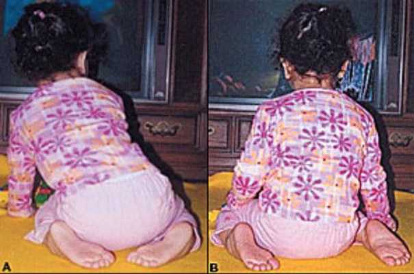 Quan sát tư thế từ chân đến đầu, đánh giá xem có sự không đối xứng của hai chân hoặc bất thường cột sống (vẹo, ưỡn, các mảng da lông, khối thoát vị…) hay không.