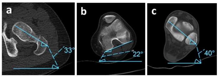 Nếu nghi ngờ bất thường xoay khi lượng giá dáng đi, cần xác định vị trí xoay là ở đoạn nào của chi dưới: háng (xương đùi), cẳng chân (xương chày) hay bàn chân bằng thước đo góc.