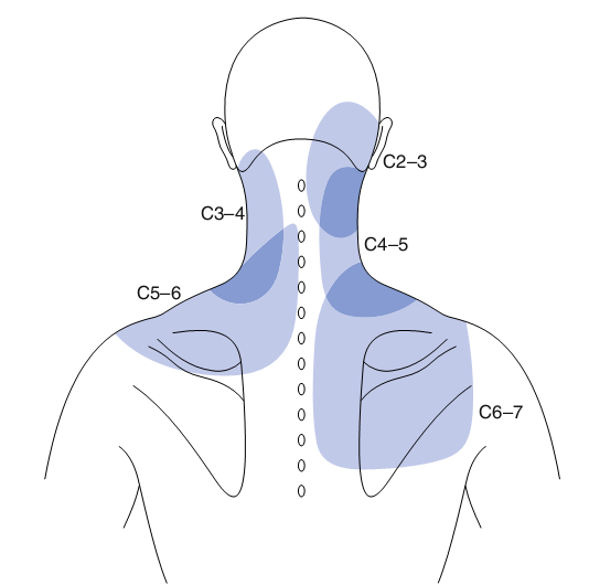 - Đau vùng gáy âm ỉ tăng từng cơn nhất là về đêm, lan lên vùng chẩm và xuống vai và cánh tay. Biểu hiện lâm sàng là hội chứng vai-gáy, hoặc hội chứng vai-cánh tay. Thường đau sâu trong cơ, xương với cảm giác nhức nhối khó chịu, có khi đau nhói như điện giật. Đau cổ thường giảm nhanh trong khi đau vai và tay thì ngày một tăng. Đau có tính chất cơ học, đau tăng khi đứng, đi, ngồi lâu, khi ho, hắt hơi, khi vận động cột sống cổ; đau giảm khi nghỉ ngơi, khi kéo giãn cột sống cổ…