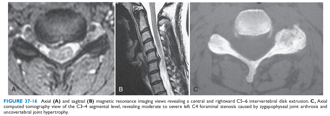 - Rối loạn vận động, cảm giác kiểu rễ: yếu một số cơ chi trên như dạng vai (C5), gấp cẳng tay (C6), duỗi cẳng tay (C7), gấp các ngón tay (C8). Có thể kèm theo hiện tượng giật bó cơ khi bị teo cơ rõ. Tê một vùng ở cánh tay, cẳng tay, bàn ngón tay. Định khu của hiện tượng giảm cảm giác tùy thuộc vào rễ thần kinh bị chèn ép. Làm nghiệm pháp căng dây thần kinh của đám rối cánh tay thì đau và tê tăng.