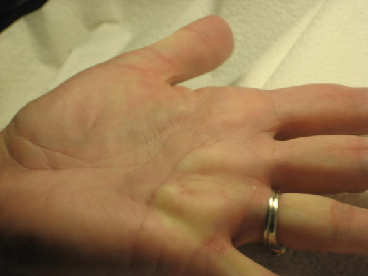 - Các nốt cứng ở lòng bàn tay, có thể đau khi sờ : các nốt dính sát với da, vận động của nốt khi vận động ngón tay gợi ý một sự phối hợp với gân và không phải là co rút Dupuytren.