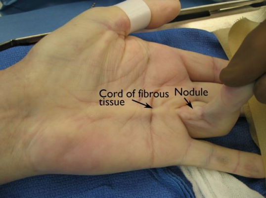 Nếu bệnh nhân trẻ hơn 40 tuổi và không bị ảnh hưởng đến mu bàn tay, bàn chân hoặc dương vật thì hiếm khi là do co rút Dupuytren.