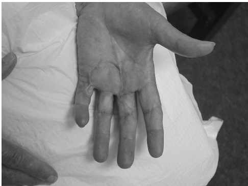 Bệnh nhân mô tả một cảm giác nổi cộm hoặc dày lên ở gan tay và đôi khi ở ngón tay. Thường sự dày lên này xuất hiện đã nhiều năm và có thể tiến triển chậm.