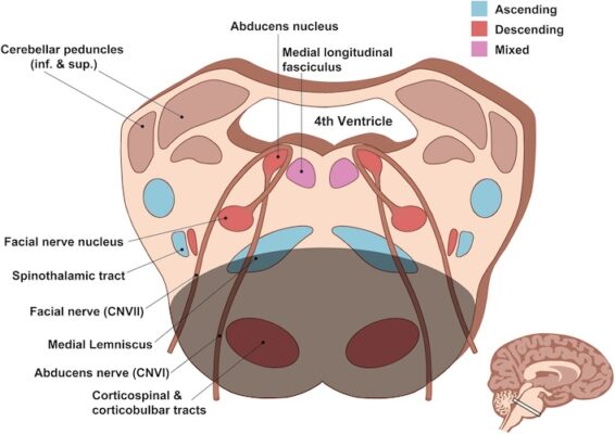 - Hội chứng Raymond: Ảnh hưởng đến các sợi dây thần kinh sọ VI, bó vỏ gai và các sợi vỏ não – mặt. Dẫn đến chứng liệt nhìn ngang cùng bên (dây VI), liệt nửa người và liệt mặt bên đối diện. Nguồn cung cấp máu liên quan là từ các nhánh của động mạch nền.