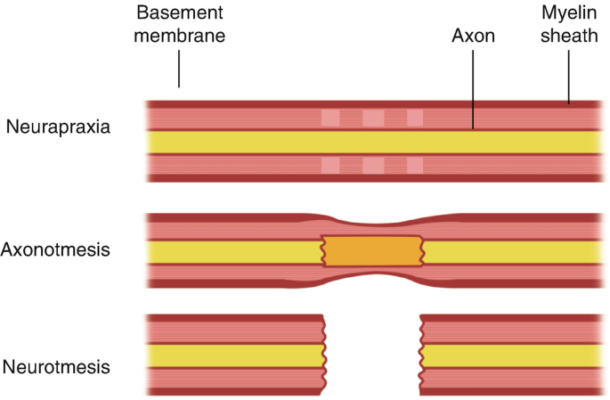 - Neurotmesis: Mức độ nặng nhất, sợi trục, bao myelin và các mô liên kết đều bị tổn thương hoặc đứt lìa hoàn toàn. Thoái hóa Wallerian xảy ra hoàn toàn. Hồi phục tự nhiên rất hạn chế hoặc không thể, thường cần can thiệp phẫu thuật để tái tạo thần kinh.