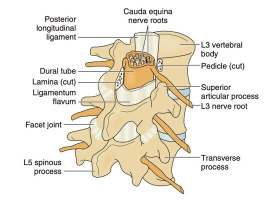 Các thành phần giải phẫu quan trọng của cột sống thắt lưng – cùng bao gồm năm đốt sống thắt lưng, L1-L5, xương cùng, các đĩa đệm, dây chằng vàng, các khớp gian mấu, các lỗ ra của rễ thần kinh cột sống thắt lưng, các rễ thần kinh sống và chùm đuôi ngựa (Hình 1).