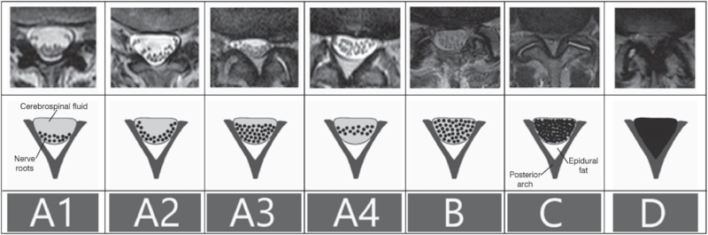 Schizas và cộng sự phân loại 7 mức độ hẹp ống sống thắt lưng dựa trên hình thái của túi màng cứng và tỷ lệ các rễ con (rễ thần kinh) so với dịch não tủy trên hình ảnh T2W cắt ngang: