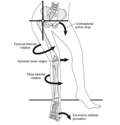- Các bài tập đề nghị: các bài tập mạnh cơ dạng háng ở tư thế nằm nghiêng, các hoạt động một chân (squat một chân và lunge, bước chân xuống bục), bài tập hạ chậu (pelvic drops), lunge ở nhiều mặt phẳng.