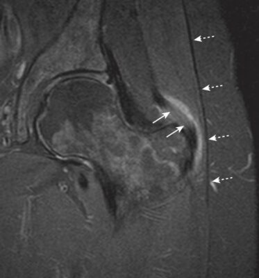Hình ảnh MRI T2 xung xoá mỡ mặt phẳng trán một bệnh nhân đau mặt ngoài háng và viêm túi thanh mạc với tăng tín hiệu do dịch giữa dải chậu chày (mũi tên chấm trắng) và gân cơ mông nhỡ (mũi tên trắng)