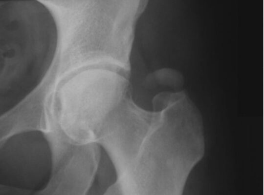 X quang khớp háng một bệnh nhân bị viêm gân can xi hoá do lắng đọng tinh thể hydroxyapatie ở gân cơ mông phía trên mấu chuyển lớn