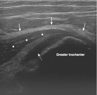 Hình: Siêu âm mặt phẳng cắt ngang háng ở một bệnh nhân đau mặt ngoài háng. Có dịch nghèo echo trong túi thanh mạc dưới cơ mông nhỡ (mũi tên chấm trắng), nằm giữa cơ và gân mông nhỡ (hoa thị) và diện nhỏ sau ngoài của mấu chuyển lớn. Dải chậu chày ở nông so với cơ mông nhỡ (mũi tên trắng).