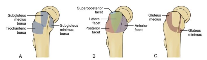 Hình . Giải phẫu mấu chuyển lớn với các vị trí bám tận của gân cơ và các túi thanh mạc. (A) Ba túi thanh mạc chính và vị trí của chúng. (B) Hình dạng mấu chuyển lớn với các diện nhỏ. (C) Nơi bám tận của gân cơ mông nhỡ và mông nhỏ. (Chỗ bám tận của gân cơ mông nhỏ là diện trước; của cơ mông nhỡ ở diện nhỏ ngoài và trên ngoài; và của cơ mông lớn và túi thanh mạc mấu chuyển là ở diện nhỏ sau)