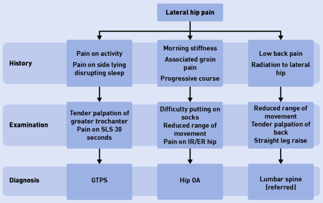 Hình : Một lưu đồ chẩn đoán tóm tắt các đặc điểm lâm sàng chính để chẩn đoán phân biệt của GTPS. ER = external rotation. GTPS = greater trochanteric pain syndrome. IR = internal rotation. OA = osteoarthritis. SLS = single leg stance.