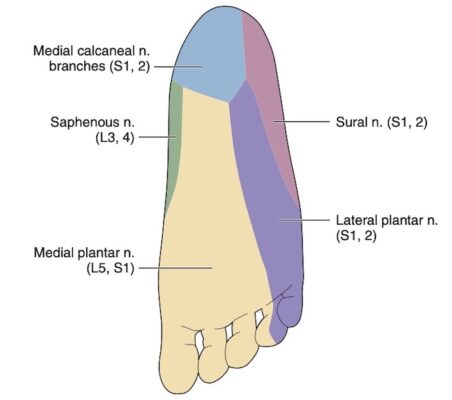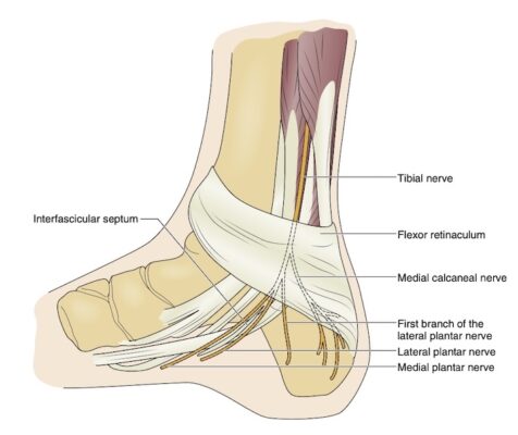 Ở mức cổ chân, dây thần kinh chày thường chia thành ba nhánh: dây thần kinh gan chân trong, dây thần kinh gan chân ngoài và dây thần kinh gót chân trong.