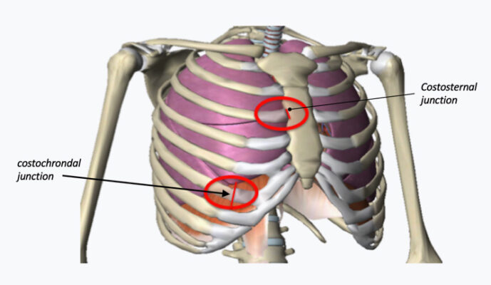 - Đau ngực dữ dội, nhức nhối hoặc giống như bị đè ép là triệu chứng phổ biến. Đau ngực có thể kèm hoặc không kèm theo đau lan tỏa đến vai, cánh tay, vùng cổ trước hoặc vùng xương bả vai. Khởi phát thường liên quan đến những thay đổi về tư thế và các thao tác gây tác động lên các cấu trúc thành ngực (khác với bệnh lý tim là do gắng sức). Hầu hết trường hợp viêm sụn sườn gây đau thành ngực trước ở nhiều mức, thường là khớp sụn sườn thứ hai đến thứ năm và các xương sườn thứ ba và thứ tư. Ngược lại, hội chứng Tietze thường ảnh hưởng đến một khớp. Đau sụn sườn thường ở bên trái nhiều hơn.