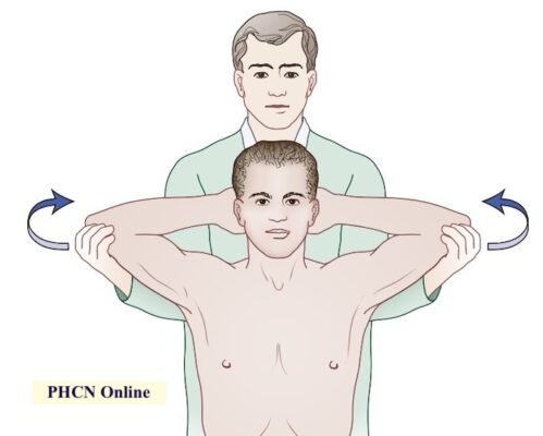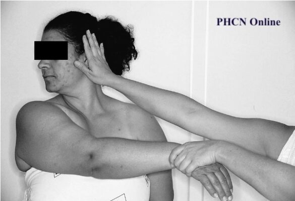 - Nghiệm pháp gập ngang (horizontal flexion test), gập cánh tay ngang qua trước ngực với lực kéo kéo theo hướng nằm ngang, đồng thời, yêu cầu bệnh nhân xoay đầu sang vai cùng bên càng xa càng tốt.