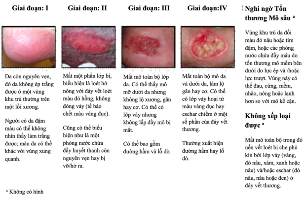 Cần đánh giá số lượng, vị trí và mức độ/giai đoạn loét ép (theo NPUAP) và giai đoạn lành vết thương (viêm- tăng sinh- trưởng thành).