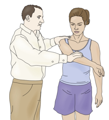 Sờ đai vai xem các vùng đau, đau trên mỏm quạ gợi ý căng cơ ngực lớn liên quan đến loạn động bả vai.