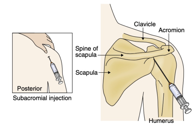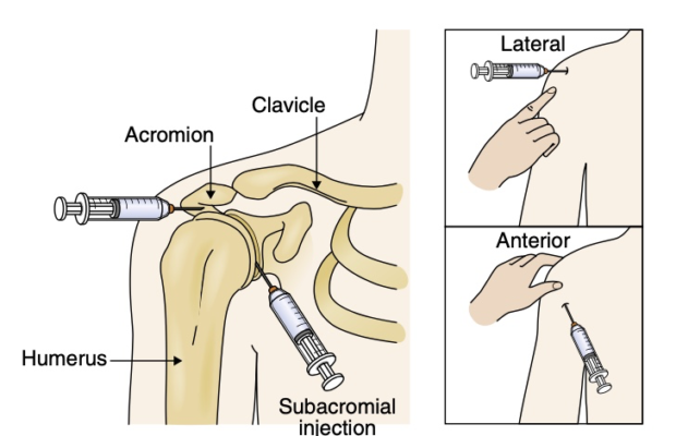 Nếu bệnh nhân vẫn có triệu chứng đau thứ phát do kích thích các cơ chóp xoay mặc dù đã tham gia một chương trình phục hồi chức năng thích hợp, thì có thể xem xét tiêm corticoid dưới mỏm cùng vai, có hướng dẫn siêu âm hoặc không. Có thể tiêm qua đường trước, sau hoặc bên với 3-5 mL thuốc tê -corticoid (ví dụ: 4 mL lidocain 1% và 1 mL triamcinolone hoặc methylprednisolone 40 mg / mL).