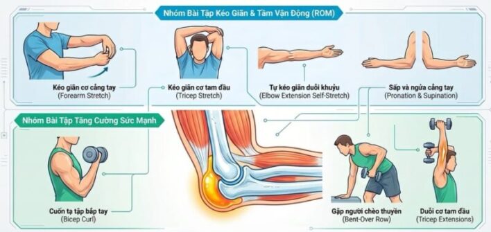 - Kéo giãn: cơ cẳng tay, cơ tam đầu