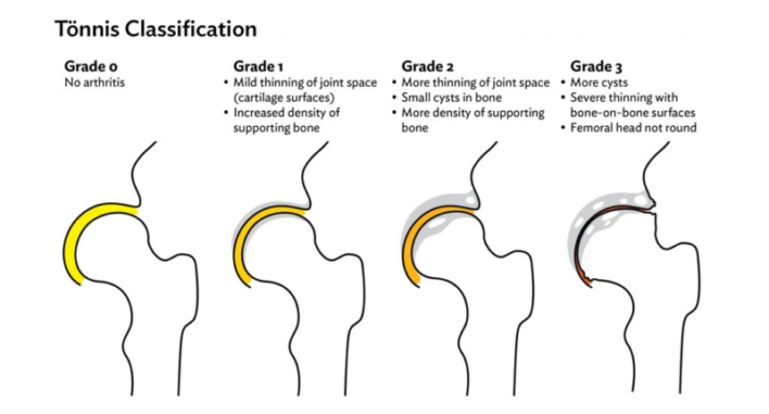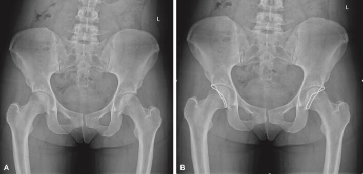 Chụp X quang thường quy (thẳng, nghiêng) vẫn là thăm dò cơ bản trong đánh giá đau khớp háng. Ở những người bị đau vùng bẹn hoặc rách ổ cối, ít nhất một bất thường về xương phù hợp với FAI xuất hiện ở 94,3% và 87% trong các nhóm này. Ở nam, góc alpha tăng và ở nữ giới, độ Tonnis hoặc góc thân – cổ xương đùi giảm có liên quan đến rách sụn viền lớn hơn.