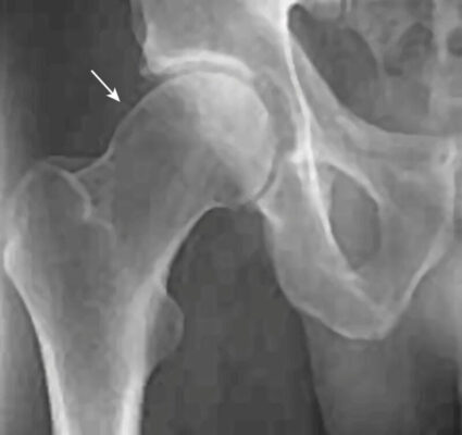 Dấu hiệu X quang cơ bản của FAI loại chỏm là giảm khoảng cách rìa xiên cổ – chỏm xương đùi ở phía trước hoặc trên, làm cho điểm nối cổ – chỏm xương đùi có vẻ phẳng hoặc lồi thay vì lõm. Đặc điểm này thường được gọi là biến dạng tay cầm súng lục.