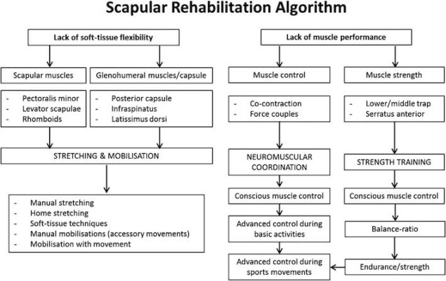 Hình 4 tóm tắt một thuật toán suy luận lâm sàng có thể sử dụng để điều trị rối loạn vận động bả vai. Phần trên của thuật toán trình bày một bản tóm tắt về các nguyên nhân có thể gây ra chứng rối loạn vận động bả vai, phần dưới đề xuất các các chiến lược điều trị. Thuật toán được chia thành hai cột, vì một bệnh nhân bị rối loạn vận động bả vai có thể có vấn đề về tính mềm dẻo hoặc vấn đề về hoạt động cơ hoặc cả hai. Mỗi vấn đề cần một tiếp cận phục hồi chức năng cụ thể. Khiếm khuyết tính mềm dẻo cần được giải quyết bằng các kỹ thuật kéo giãn và di động, trong khi mục tiêu chính đối với bệnh nhân có vấn đề về hoạt động cơ là bình thường hóa huy động cơ. Nếu bệnh nhân bị suy giảm cả tính mềm dẻo và rối loạn chức năng cơ, thì cần giải quyết cả hai vấn đề.