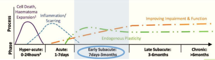 - Bán cấp sớm (3 tháng đầu sau đột quỵ): giải thích cho sự hồi phục tự phát sớm sau đột quỵ (giải quyết các yếu tố độc hại tại chỗ; cải thiện tuần hoàn tại chỗ; sự hồi phục của các neuron bị tổn thương một phần).