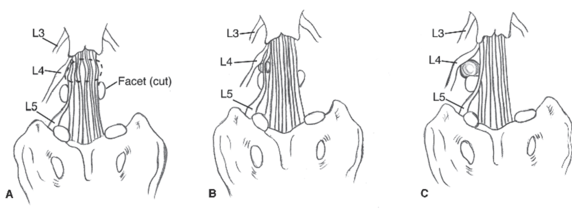 HÌnh 3: Phân loại thoát vị đĩa đệm theo liên quan với rễ thần kinh và ống sống. (A) thoát vị trung tâm, (B) thoát vị cạnh trung tâm, và (C) thoát vị xa bên