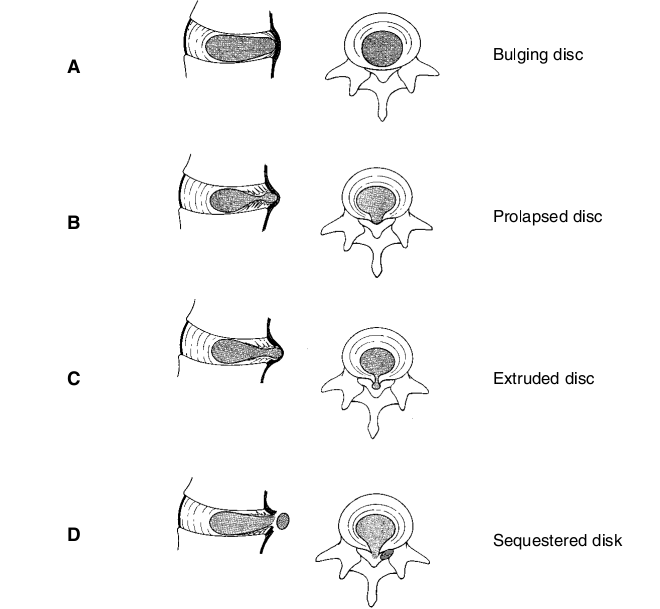 Wood chia thoát vị đĩa đệm làm 4 loại dựa trên sự tương quan giữa khối thoát vị với vòng sợi, và dây chằng dọc sau: