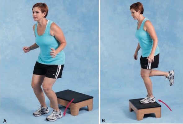- Khi người tập đã học được thăng bằng bằng một chân và thể hiện khả năng kiểm soát trong bài tập nhảy và giữ yên, hãy tăng tiến kết hợp nhảy xuống từ một bậc cấp và giữ yên tư thế cuối, sau đó cho người tập nhảy lên bậc và giữ lại (Hình 15 B).