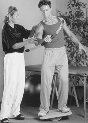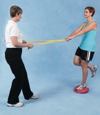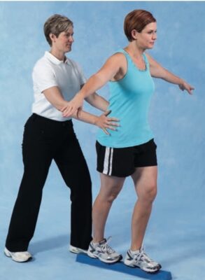 - Yêu cầu bệnh nhân lấy thăng bằng trong khi đứng trên ván thăng bằng hoặc BOSU®, sau đó đá chân về phía trước và phía sau và sang một bên trong khi cố gắng kiểm soát vận động và duy trì thăng bằng. Hướng dẫn người tập không để các cạnh của ván thăng bằng chạm sàn.