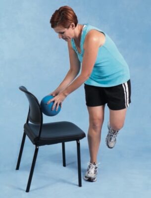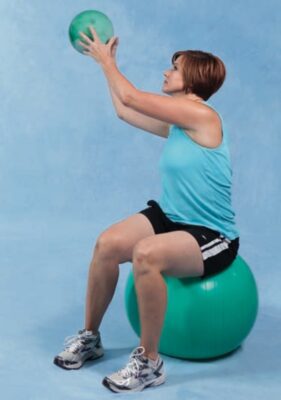 - Tung một quả bóng (không có trọng lượng hoặc có trọng lượng) sao cho người tập phải vươn tay ra ngoài, lên trên hoặc xuống dưới để bắt và ném trả lại. Nhắc người tập giữ cột sống thẳng và co cơ bụng khi vươn lên trên để giữ ổn định cột sống hoặc xoay hông chứ không phải xoay cột sống khi vươn ra ngoài hoặc hướng xuống.