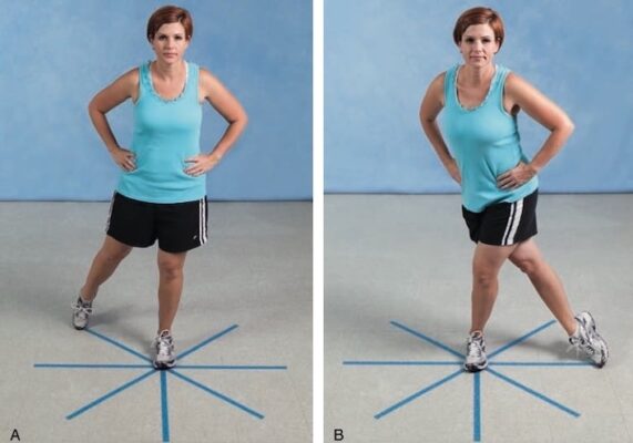 - Vẽ một hình chéo sao (chẳng hạn như bốn đường thẳng giao nhau) trên sàn nhà. Yêu cầu người tập đứng một chân lên tâm của hình và sau đó chạm vào bàn chân kia lên các đường chéo của hình: thẳng ra trước, chéo về phía trước, sang ngang, chéo về phía sau (Hình 10 A), thẳng về phía sau và chéo về phía sau ( Hình 10 B). Sau đó đổi chân và lặp lại với chân kia.