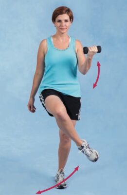 - Yêu cầu người tập thực hiện các mẫu chéo ở chi trên, một bên hoặc hai bên, sử dụng quả tạ tay hoặc dây (ống) đàn hồi trong khi giữ thăng bằng trên một chân (Hình 9). Khi sử dụng lực cản đàn hồi, hãy thay đổi góc kéo để thay đổi độ khó và đáp ứng thăng bằng.