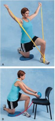 - Yêu cầu người tập quỳ trên trục lăn bằng xốp (foam roller), ván thăng bằng, BOSU®, hoặc quả bóng tập lớn bị xì hơi một phần và thực hiện các vận động của cánh tay theo nhiều hướng khác nhau; tiến triển hoạt động bằng cách để người tập vận động cánh tay chống lại lực cản (trọng lượng hoặc lực cản đàn hồi).