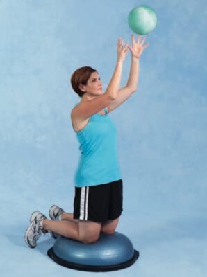 - Trong khi quỳ trên bề mặt không ổn định, người tập bắt và trả lại một quả bóng. Tăng tiến bằng cách sử dụng một quả bóng có trọng lượng (Hình 4).