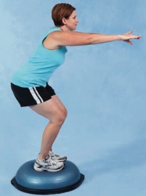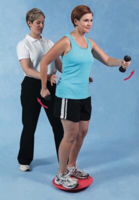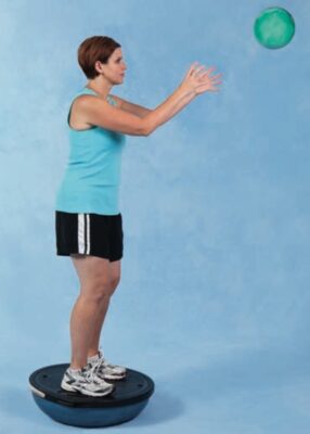 - Để người tập đứng trên nửa con lăn bằng xốp (mặt cong hướng xuống), ván thăng bằng, hoặc BOSU®; thêm các xáo động nếu người tập có thể giữ được.